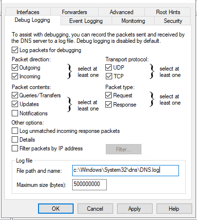 c:\Windows\System32\dns\DNS.log.In Maximum size (bytes), enter a safe limit. For example, for 500 MB, enter