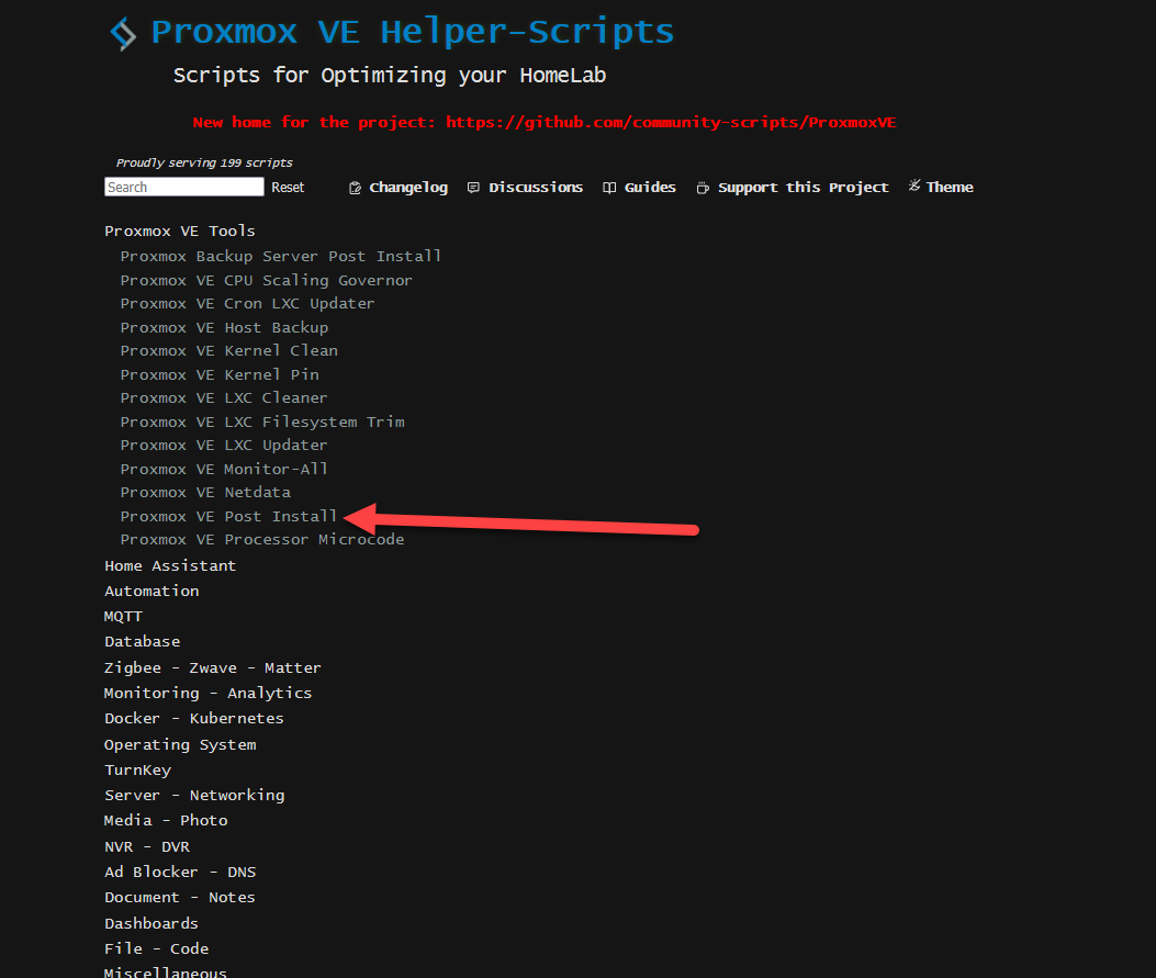 Navigate to the Helper-Scripts website. The script we are interested in is the Proxmox VE Post Install script, usually found under the Proxmox VE Tools section.