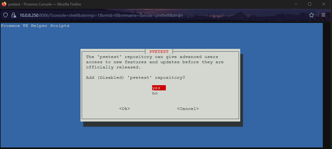 4. Test Repositories: It will ask if you want to add the disabled pvetest repository. Answer No. You generally do not want unstable test packages in a production or stable lab environment.