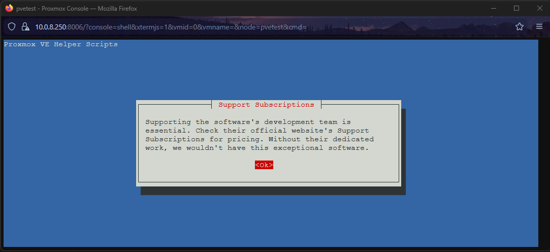 An informative message will appear reminding you that while the community repos are great, purchasing a subscription directly supports the Proxmox developers. Click OK to acknowledge it.