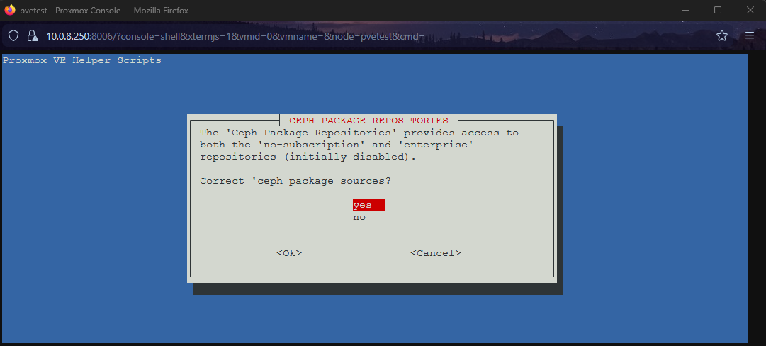 3. Ceph Package Repositories: It will ask to correct the Ceph package repositories. Answer Yes to ensure you fetch Ceph updates from the no-subscription branch as well.
