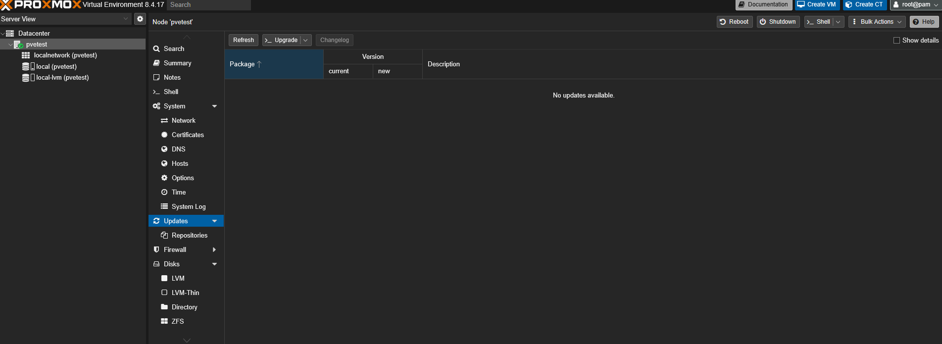 Your Proxmox VE hypervisor is now clean, optimized, and natively up to date. Remember to keep your node updated periodically; you can now perform safe upgrades directly from this Updates window by simply clicking the >_Upgrade button.