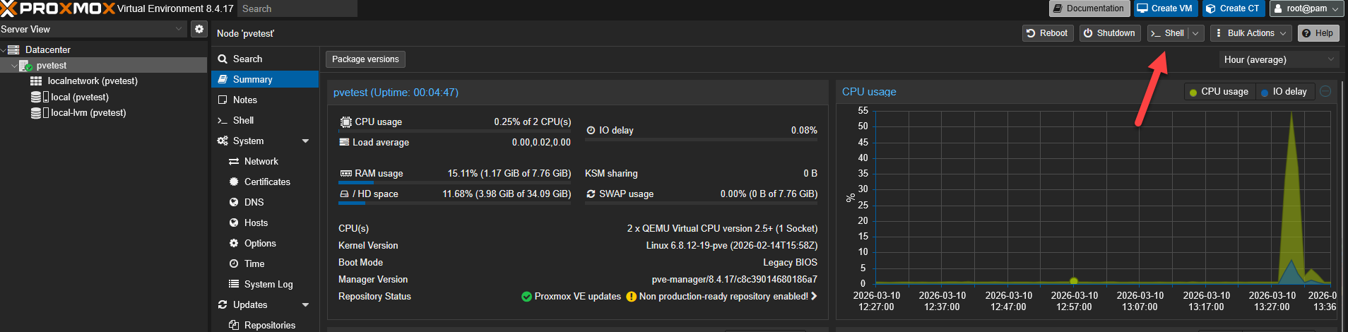 Go to your Proxmox VE web interface. Select your node on the left panel and click on >_Shell.
