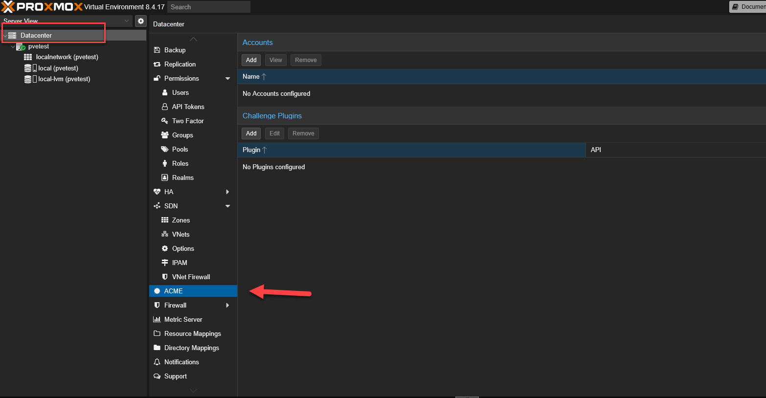 Select your Datacenter on the left panel, navigate to ACME, and click on the Add button under the Accounts section.