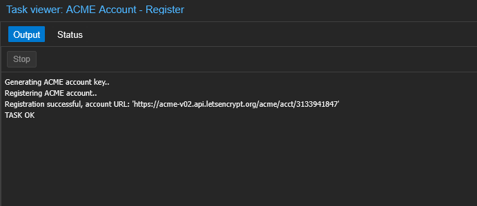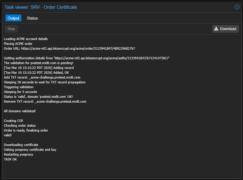 A task viewer will appear. You will see Proxmox communicating with Let’s Encrypt, the Validation Delay counting down, and finally, the successful download of the full certificate chain and private key.