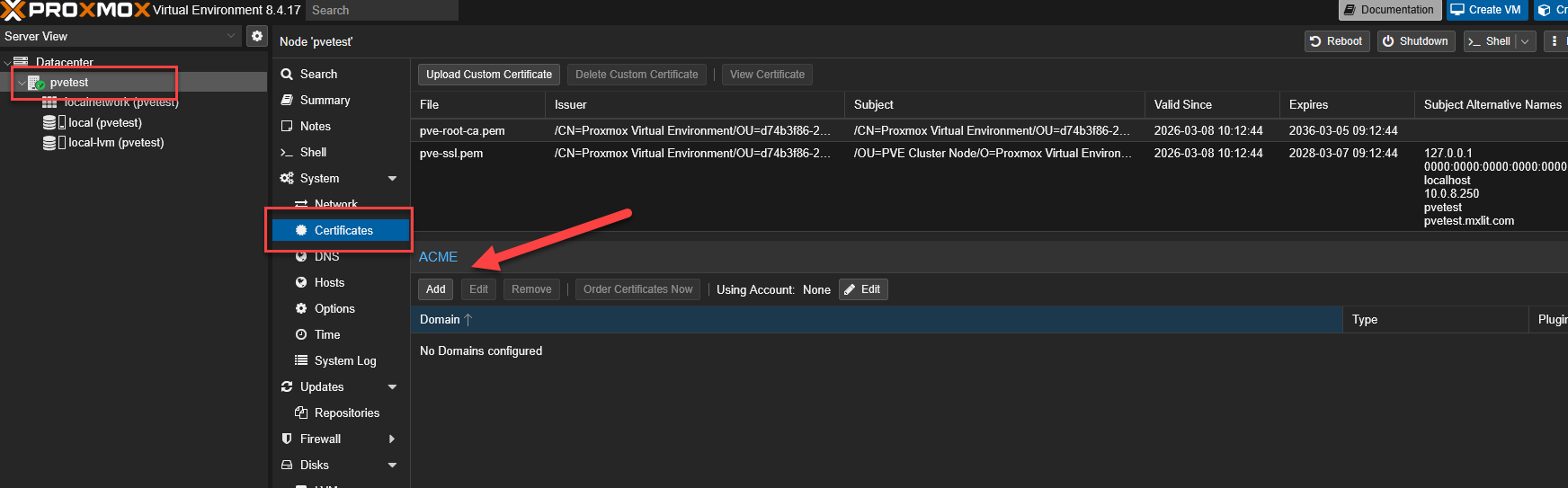 Select your physical Node on the left panel, go to Certificates, and click Add under the ACME section.