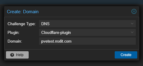 Select the DNS Plugin you just created (Cloudflare-plugin) and enter the exact fully qualified Domain name of your Proxmox server (e.g., pve.yourdomain.com). Click Create.