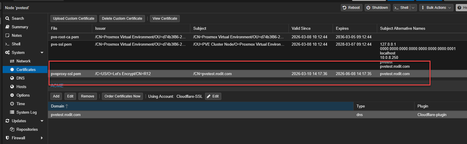 Now that the Datacenter has an ACME account and a DNS plugin, we must apply them to the specific hypervisor node.