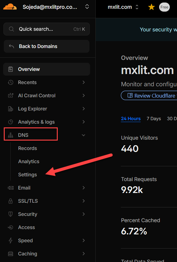 - In the left sidebar menu, expand the DNS section and click Settings.