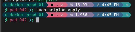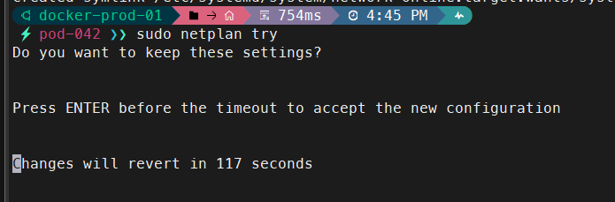 If you lose the connection, Netplan will automatically revert changes in 120 seconds. If the connection holds and you see the success message, press ENTER to confirm, or manually apply: