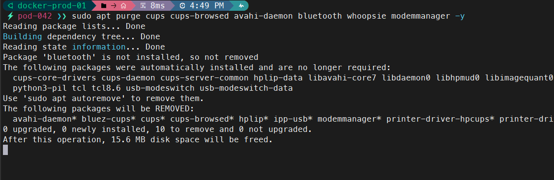 sudo apt purge cups cups-browsed avahi-daemon bluetooth whoopsie modemmanager -y