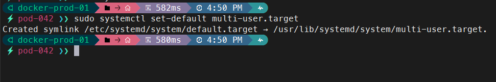 Finally, we must tell systemd that the system should boot exclusively in console mode on the next restart, preventing it from trying to load non-existent graphical components that could cause a kernel panic or boot hang.